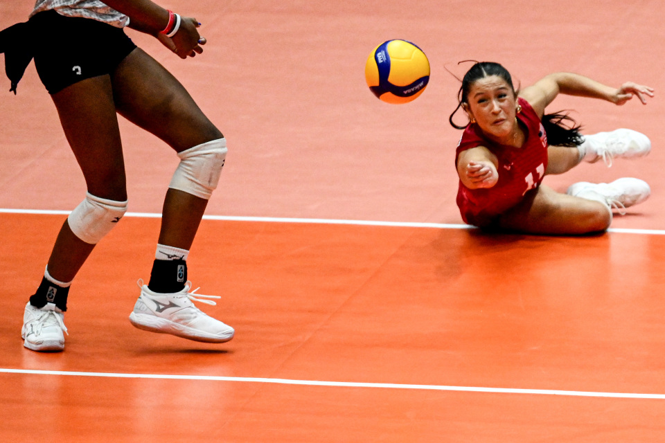 8月12日,美国队球员罗德里格斯在比赛中救球。新华社发(阿贡·昆卡亚摄)