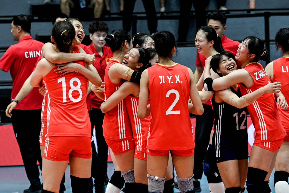 8月12日,中国队球员在比赛中庆祝。新华社发(阿贡·昆卡亚摄)