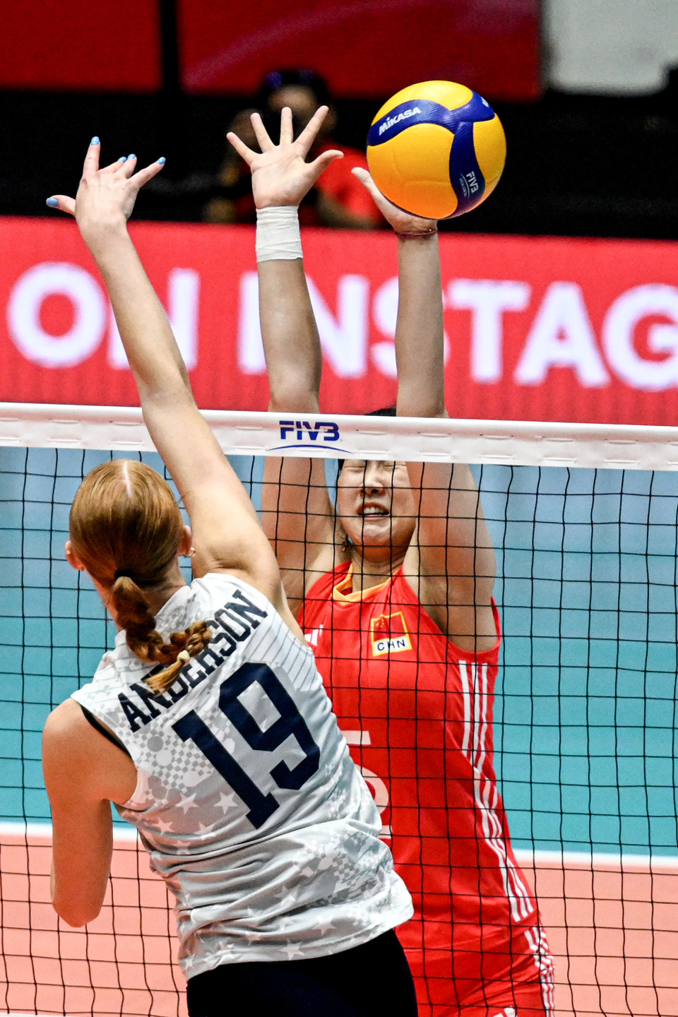 8月12日,中国队球员单琳倩(左)在比赛中拦网。新华社发(阿贡·昆卡亚摄)